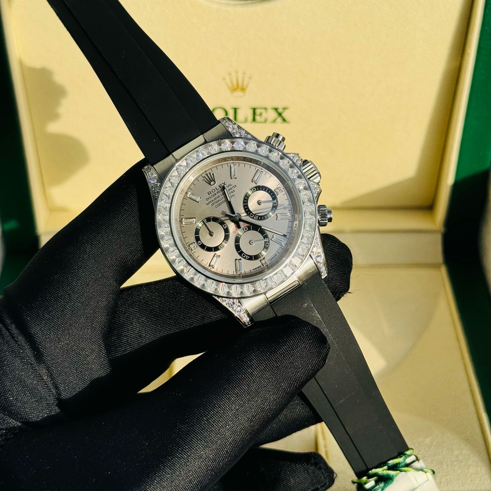 Rolex Cosmograph Daytona 40mm White Gold Steel Diamond Dial Diamond Bezel Black Rubber Bracelet Replica Mans Watch-126539TBR-0002