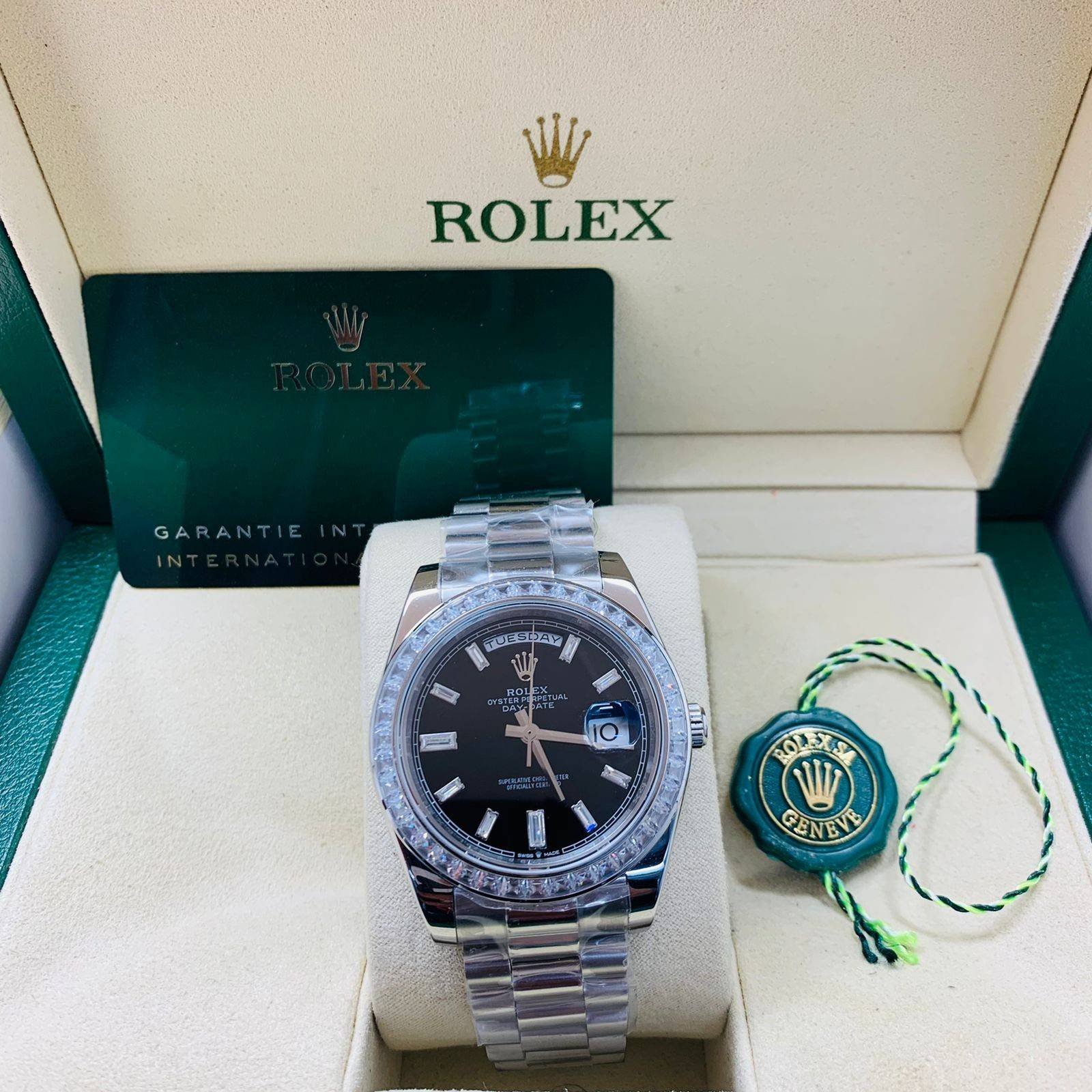 Rolex Day Date 40mm Platinum Black Diamond Dial Diamond Bezel President Bracelet Replica Mens Watch-228396TBR-0012